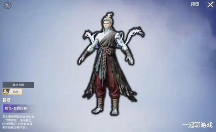 然后再来看玄霖雨神,这个角色属于紫色等级,虽然是男角色,但却出现了“飘带”装饰,整体看起来还算是中规中矩吧~专属动作被光子命名为“凝水为霖”。